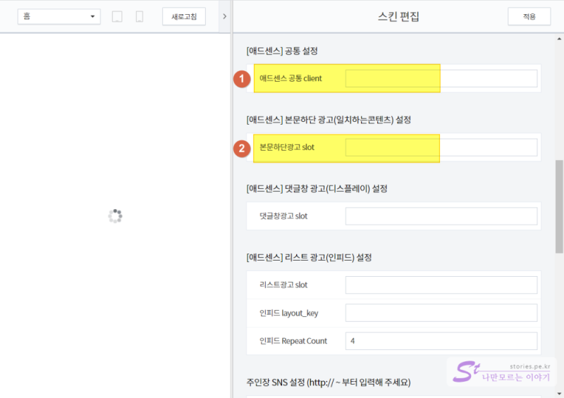 이제 스킨의 관리자 화면에서 쉽게 적용을 할 수 있습니다.