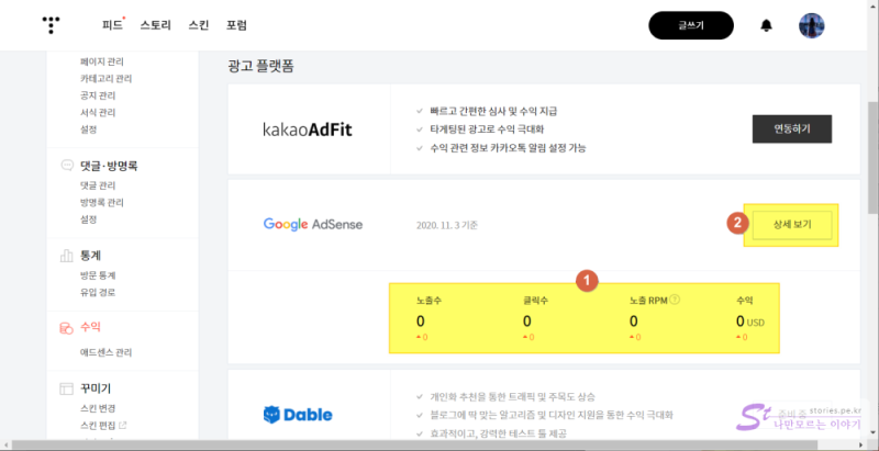 - 상세보기 버튼을 눌러서 애드센스 설정화면으로 이동합니다.