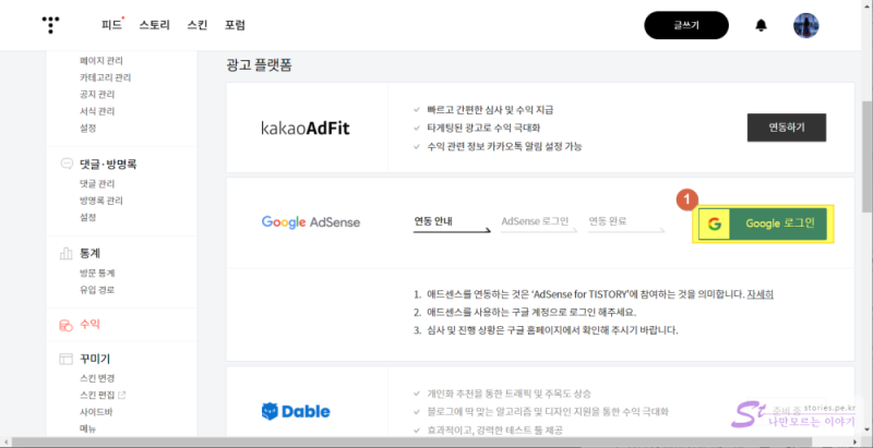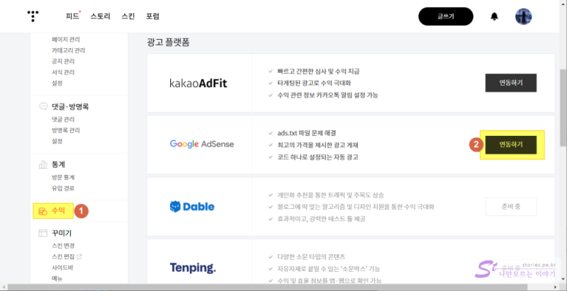 계정을 만들고 활성화가 되었다면 티스토리와 연동을 해야 합니다. 예전에는 애드센스에서 발행된 코드를 복사헤서 티스토리 플러그인이나 HTML에 붙혀넣었어야 하는데 이제는 연동만 되면 별다른 코드복사없이 자동으로 생성이 됩니다.