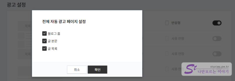 전체 자동광고는 설정값이 다른 광고와 다르게 디바이스별 설정이 아니고 티스토리 화면별로 설정을 하게 됩니다.