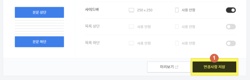 상세보기 화면으로 이동하면 하단에 광고설정 버튼이 있습니다. 해당 버튼을 활성화 시킴으로 간단히 애드센스배너를 달 수 있습니다.