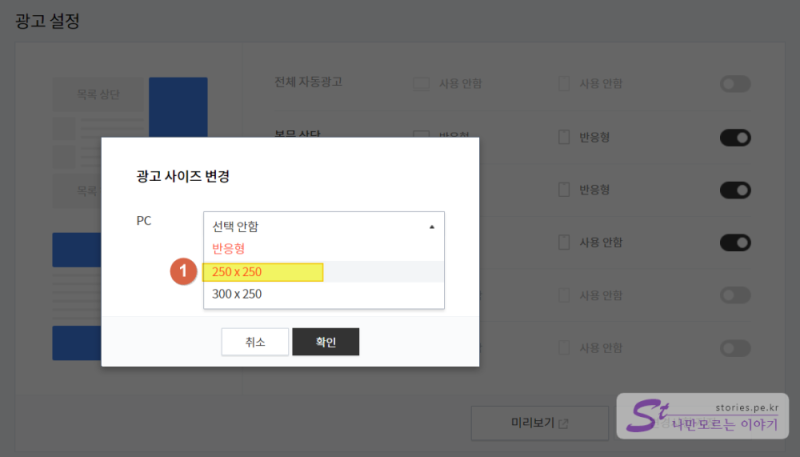 위와 같이 250 X 250 배너를 선택해야 오류가 발생하지 않습니다.