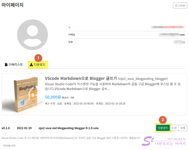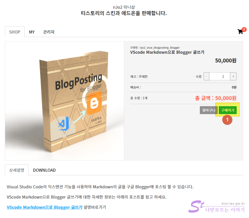 ▲ 상품 중 VScode Markdown으로 Blogger 글쓰기 또는 VScode Markdown으로 Tistory 글쓰기를 선택하고 구매 합니다.