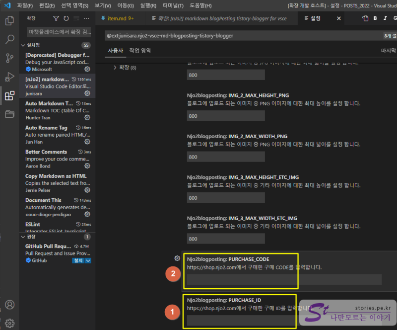Visual Studio Code의 익스텐션인 [nJo2] markdown blogPosting for vsce로 블로그에 글을 쓰기 위해서는 제품을 구매하고 획득한 Product ID와 CODE를 제품에 등록/설정을 해야 합니다. 그 설정하는 방법은 아래와 같습니다.