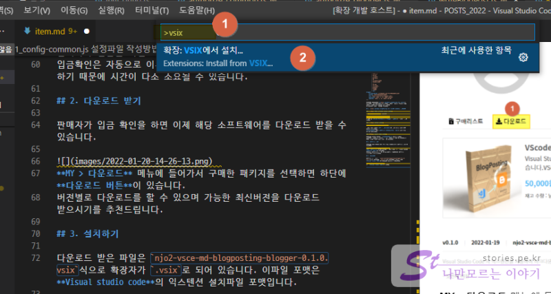 다운로드 받은 파일은 njo2-vsce-md-blogposting-xxxxx-xxxx.vsix식으로 확장자가 .vsix로 되어 있습니다. 이파일 포맷은 Visual studio code의 익스텐션 설치파일 포맷입니다.