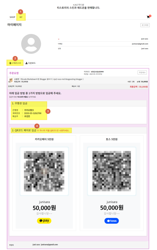 구매를 하면 MY > 구매리스트에 구매 목록과 입금 요청 화면이 표시됩니다.