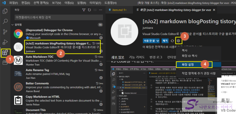 [nJo2] markdown blogPosting~~~라는 메뉴가 보입니다. 해당 메뉴를 선택하세요. - 오른쪽에 익스텐션의 정보화면이 보이는데, 그중 설정 버튼을 클릭합니다.