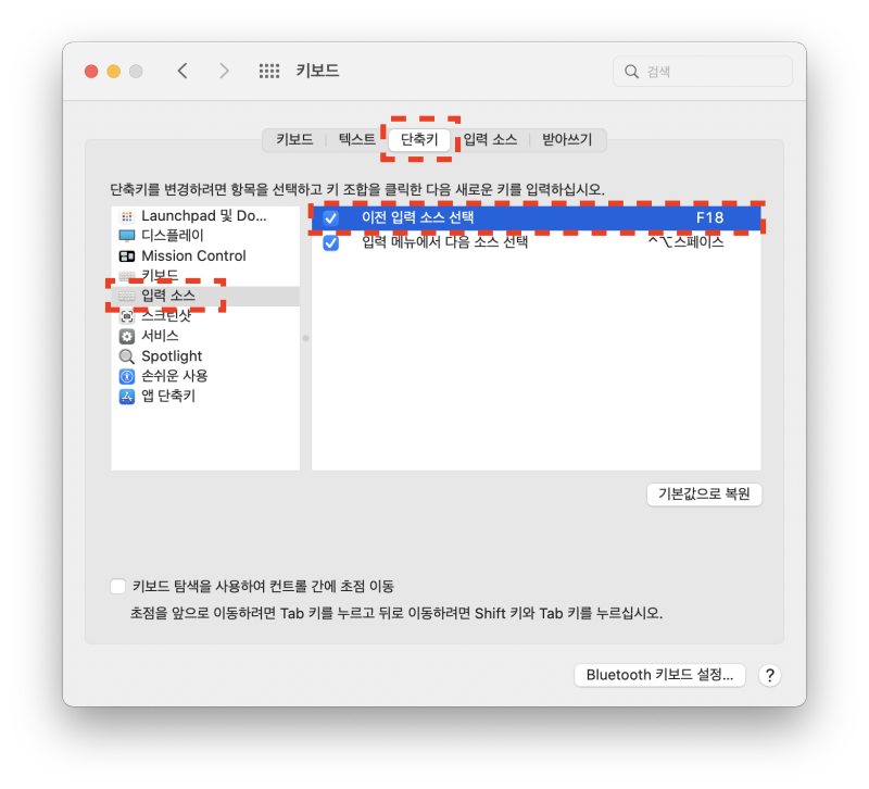 단축키 > 입력 소스 > 이전 입력 소스 선택을 클릭하여 F18(right Command)를 선택합니다. 이렇게 하면 오른쪽 Command키를 누르면 한영 키가 전환이 됩니다.