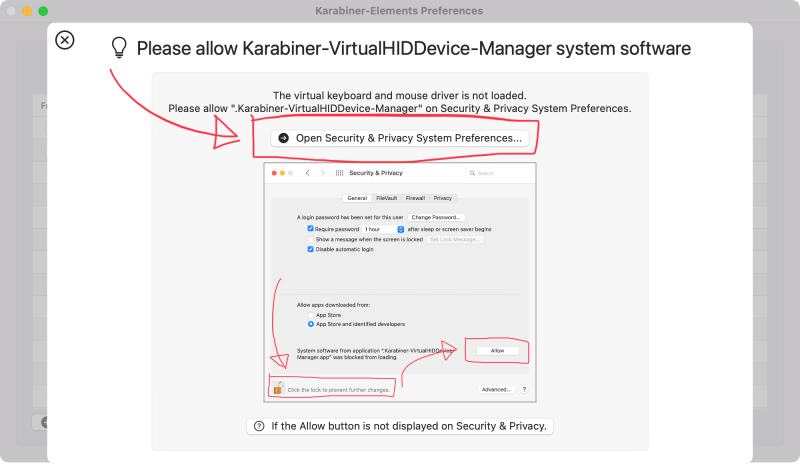 - Karabiner-Elements Preferences를 열면 다음 경고가 표시됩니다.