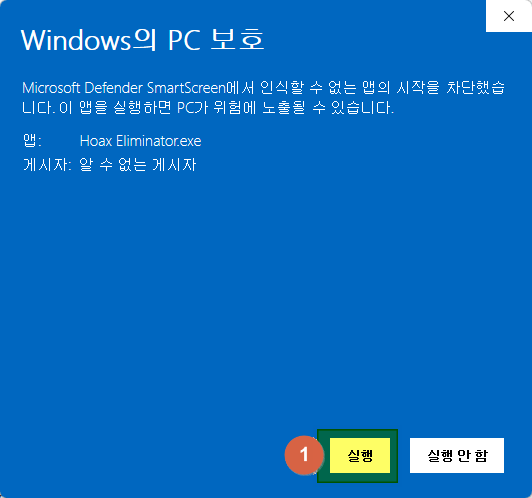 1번인 구라제거기를 설치하면 일단 윈도우에서 정말 설치할 것이냐고 물어봅니다. 해당 프로그램이 Windows에 등록이 되어 있지 않다 보니 일단 막고 보는 것이니 그냥 설치를 진행하시면 됩니다.