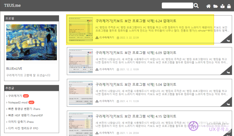 먼저 개발자님의 블로그 사이트로 이동을 합니다. 티스토리 블로그를 사용해서 배포를 하고 계십니다. (감사~)