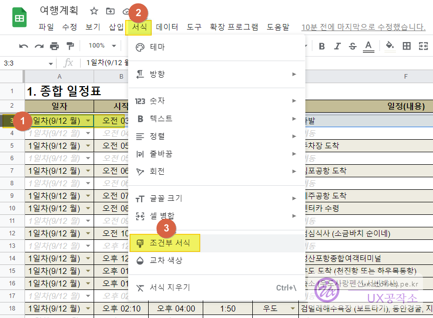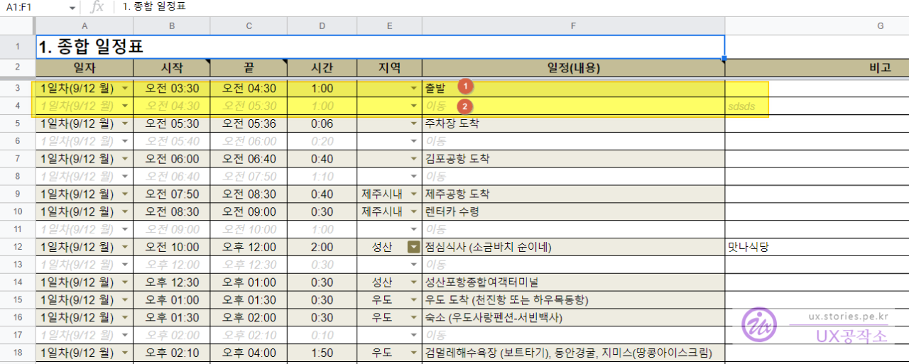 2번의 **일정(내용)**에 **"이동"**이라는 단어가 나오면 해당 행의 배경색을 흰색으로 칠하고 글자는 이태릭체에 회색으로 변경돼서 잘 보이지 않게 해라.