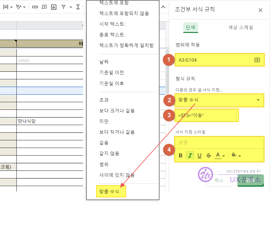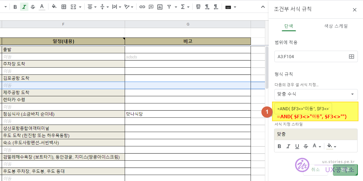 =$F3="이동"의 조건을 지정했습니다.- 조건 수식은 표준 표기법(='sheetname'!cell)을 따릅니다.