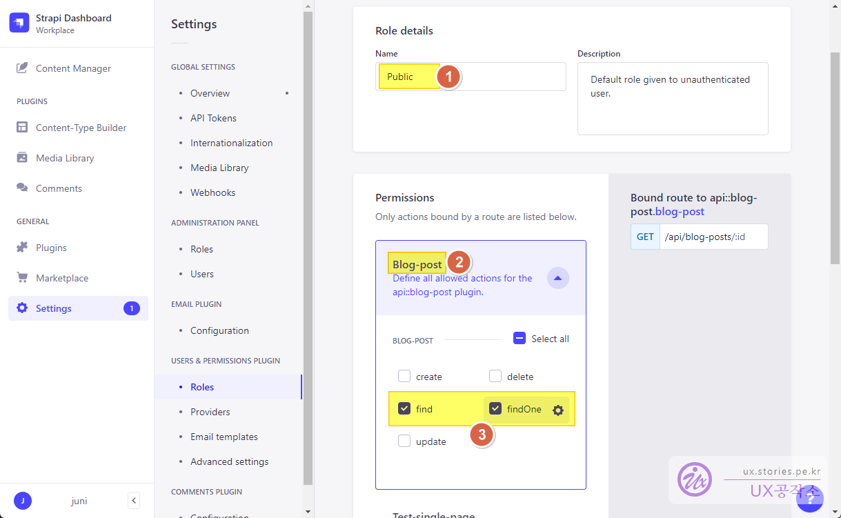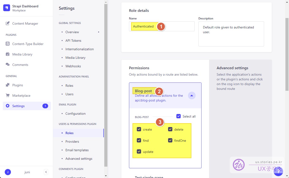 Authenticated와Public2개의 Role이 있습니다.Authenticated는 로그인 인증을 한 회원,Public은 로그인 인증을 하지 않은 사람의 접근 권한을 설정할 수 있습니다. 이 Roles는 변경도 가능하고 추가도 가능합니다. - 먼저