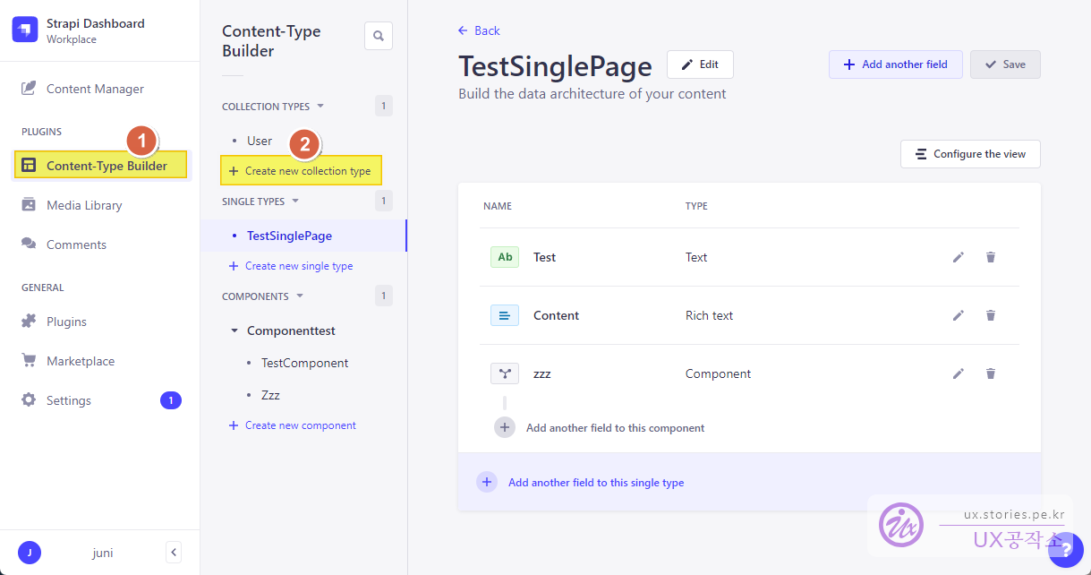 Strapi를 설치했으니 이제 한번 게시판을 만들어보겠습니다. Strapi에서는 콘텐츠 타입(Content-Type)이라고 합니다. Content-Type Builder에서 만들면 됩니다.