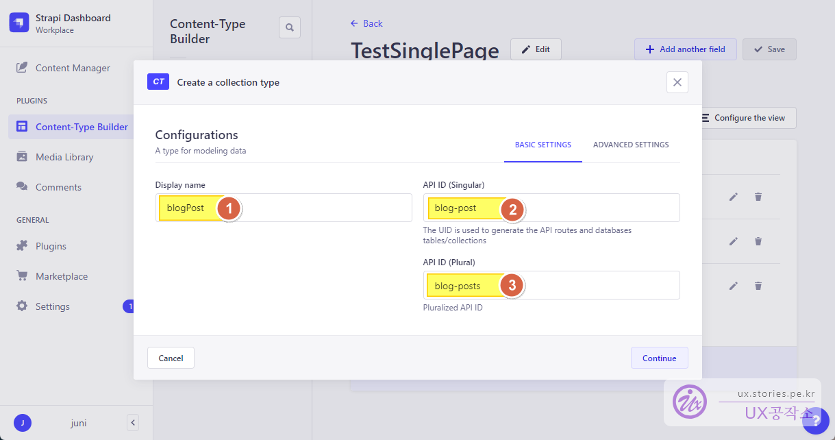 아래와 같이 Content-Type의 게시판 이름을 작성하는 팝업이 뜹니다. 여기서는 Content-Type의 이름, API로 사용할 단수형 UID와 복수형 UID가 자동으로 만들어집니다. 자동 생성되는 UID는 수동으로 변경을 할 수 있습니다. 또는 Display name을 수정할 수도 있습니다.