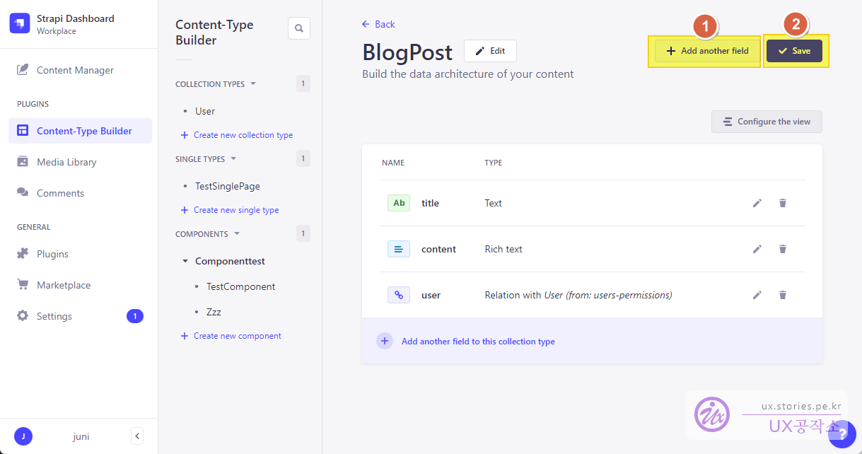 이제 3개의 입력항목(Field) title, content, user 을 만들어보겠습니다.