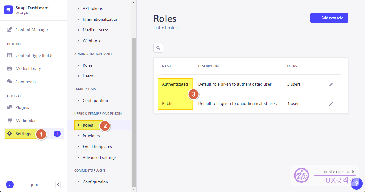 Authenticated와Public2개의 Role이 있습니다.Authenticated는 로그인 인증을 한 회원,Public은 로그인 인증을 하지 않은 사람의 접근 권한을 설정할 수 있습니다. 이 Roles는 변경도 가능하고 추가도 가능합니다. - 먼저