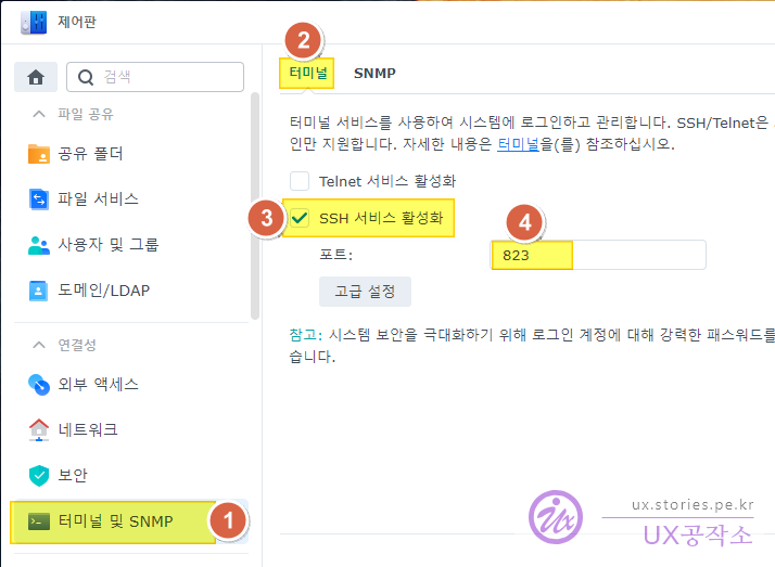 - ssh 아이디@시놀로지나스주소 -p포트번호의 형태로 명령어를 실행합니다. 예>