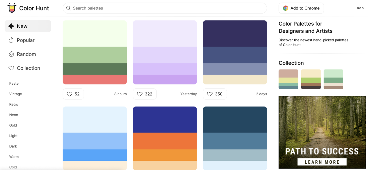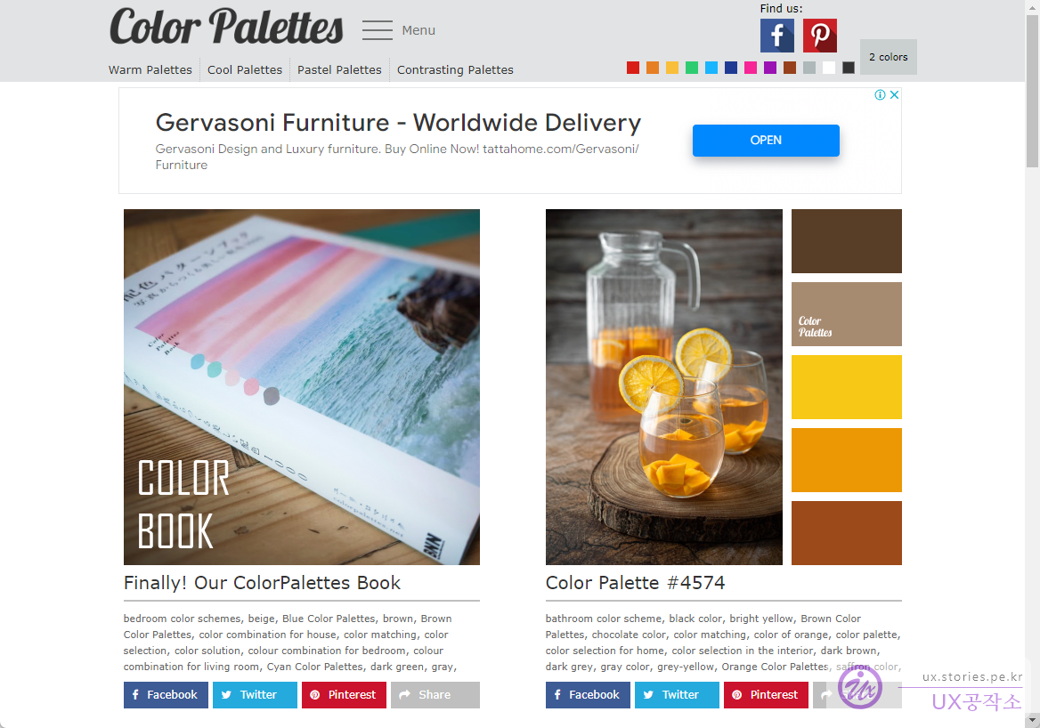 ColorPalettes.net은 광고가 다소 포함되어 있지만, 이미지를 기반으로 색상을 추출하여 자연스러운 색상 팔레트를 제공합니다. 기능은 다양하지는 않지만 자연스러운 컬러 코드를 찾는 데 유용하게 활용할 수 있습니다.