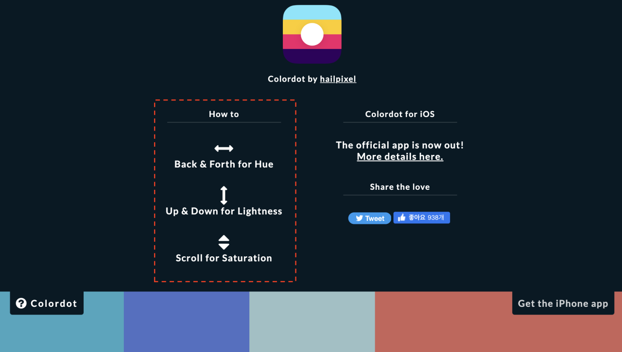 사람을 위한 색상 선택기라고 되어 있는데 이 서비스는 색상조합을 추천한다기보다는 디자이너가 색상조합을 쉽게 만든다에 초첨을 맞춘 서비스 입니다. 쉽게 색상을 선택하고 색상의 채도와 명도를 조절하여 색상조합 세트를 만들 수 있습니다.