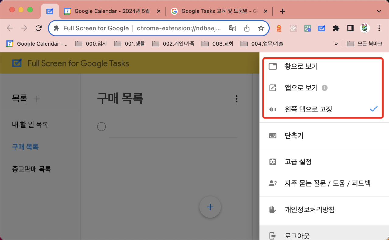 fullscreen for googletasks, TasksBoard for Google 등 이런 류의 익스텐션이 몇 개 더 있지만 사용해 본 결과 저에게는 fullscreen for googletasks 익스텐션이 더 잘 맞아서 이것을 선택했습니다.