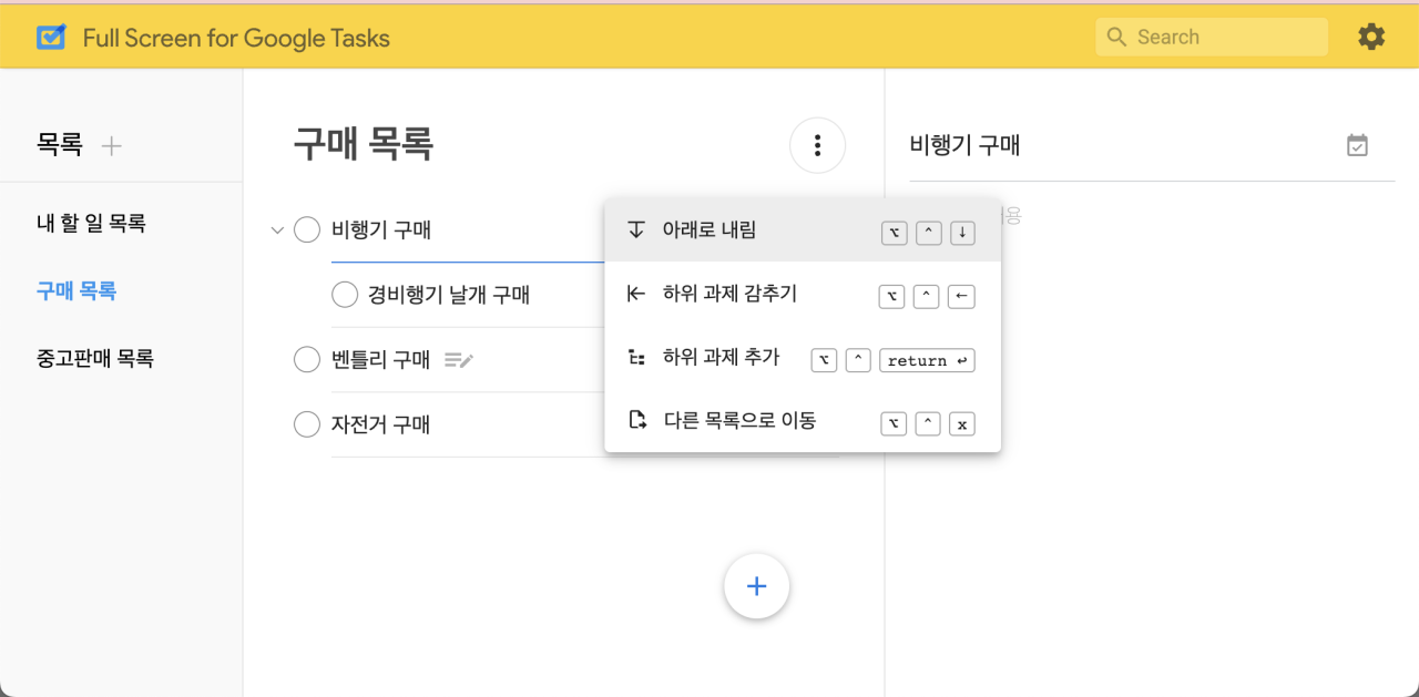 Fullscreen for googletasks를 기준으로 간단한 Tasks 사용법입니다. Fullscreen for googletasks 익스텐션의 기능은 기본 Google Tasks의 기능을 그대로 사용하고 있습니다.