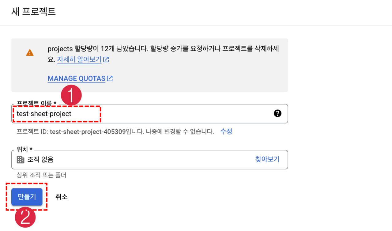 먼저 프로젝트를 하나 생성해야 합니다. 이 프로젝트에 계정을 추가하고 이 계정으로 API를 사용하게 됩니다. 아래 URL에 접속하여 신청할 수 있습니다.
