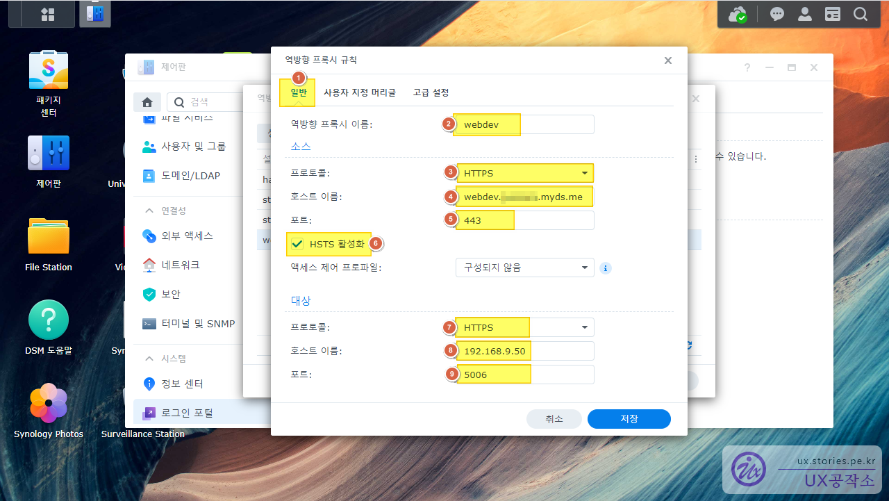 4. 시놀로지 나스 역방향 프록시 설정 : 서브 도메인으로 시놀로지 나스 서비스에 접근할수 있게 설정합니다.