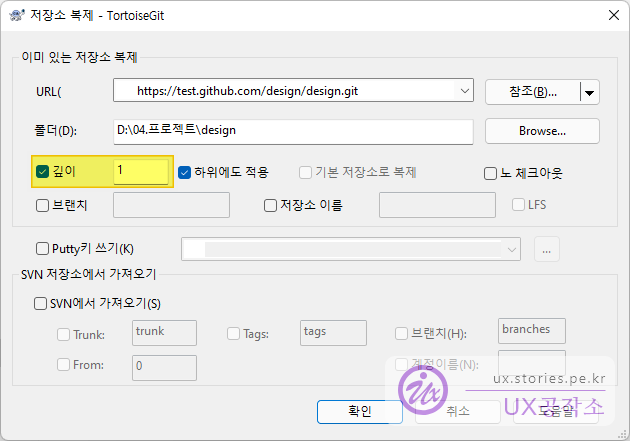 $ git clone https://test.github.com/design/design.git --depth 1 $ cd repo_design $ git fetch --unshallow 만약에 tortoiseGit을 사용한다면 아래와 같이 깊이를 1로 설정하면 동일한 효과가 발생합니다.