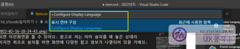 ▲ 메뉴들이 한글로 변경된 것을 확인할 수 있지요?. 만에 하나.. 설치가 되었는데도 바뀌지 않거나 강제로 언어를 변경하고자 한다면 명령창에서 직접 설정을 하면 됩니다. F1을 누르거나 Ctrl + Shift + P버튼을 동시에 누르면 나오는 명령창에 아래와 같이 입력을 합니다.