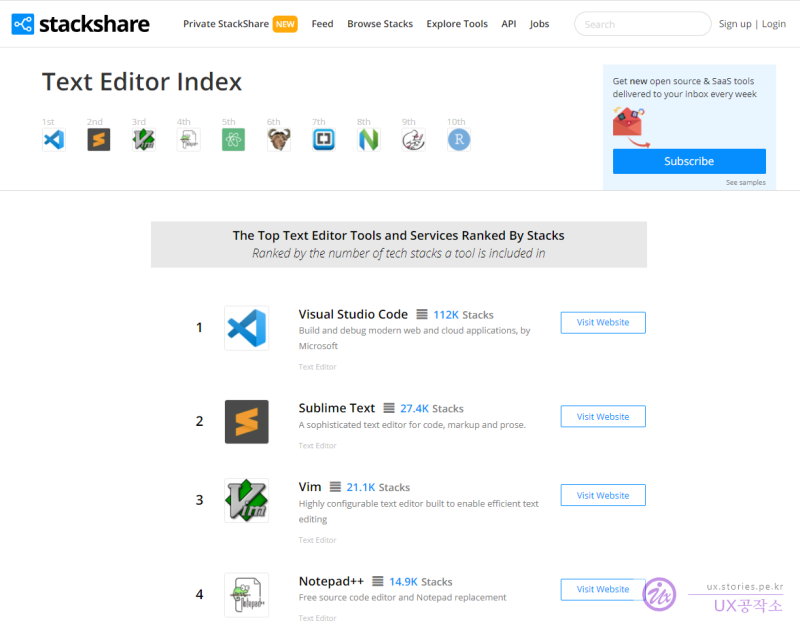 stackshare의 집계에 따르면 현재 1위로 순항 중에 있습니다. 저도 처음에는 서브라임텍스트로 시작했다가 아톰 --> 브라켓을 지나 VScode에 정착을 한 상태입니다.