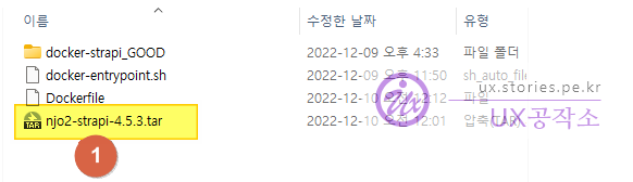 시놀로지 Docker에 이미지를 추가하기 위해서는 먼저 도커 이미지를 내려받아야 합니다. 내려받는 파일은 압축파일인 .tar로 다운로드 됩니다. 아래의 명령어를 입력하면 njo2-strapi-4.5.3.tar라는 tar 압축파일이 생성됩니다.