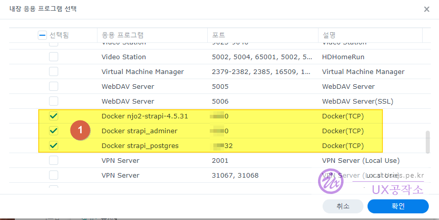 설치가 완료되었다면 시놀로지 NAS에서 방화벽을 열어줘야 합니다. 열어주지 않으면 초기 설치될 때 컨테이너가 바로 죽어버릴 수 있습니다.