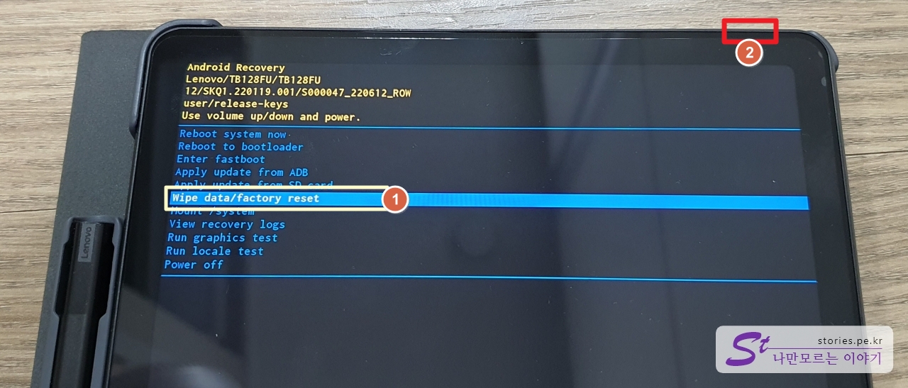 Wipe data/factory reset메뉴를 선택하여 데이터를 지우고 공장 초기화를 합니다.- 전원 버튼을 선택합니다.