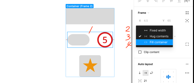 1번을 Fill container로 설정하고 2번을 Fixed width 설정을 한 상태에서 반응형 웹처럼 크기를 조정하게 되면 1번 아이템은 유동적으로 크기가 변경되며 빈 공간을 꽉 채우게 됩니다. 다시 말하면 반응형 웹에 사용되는 Auto Layout이라고 보시면 됩니다.