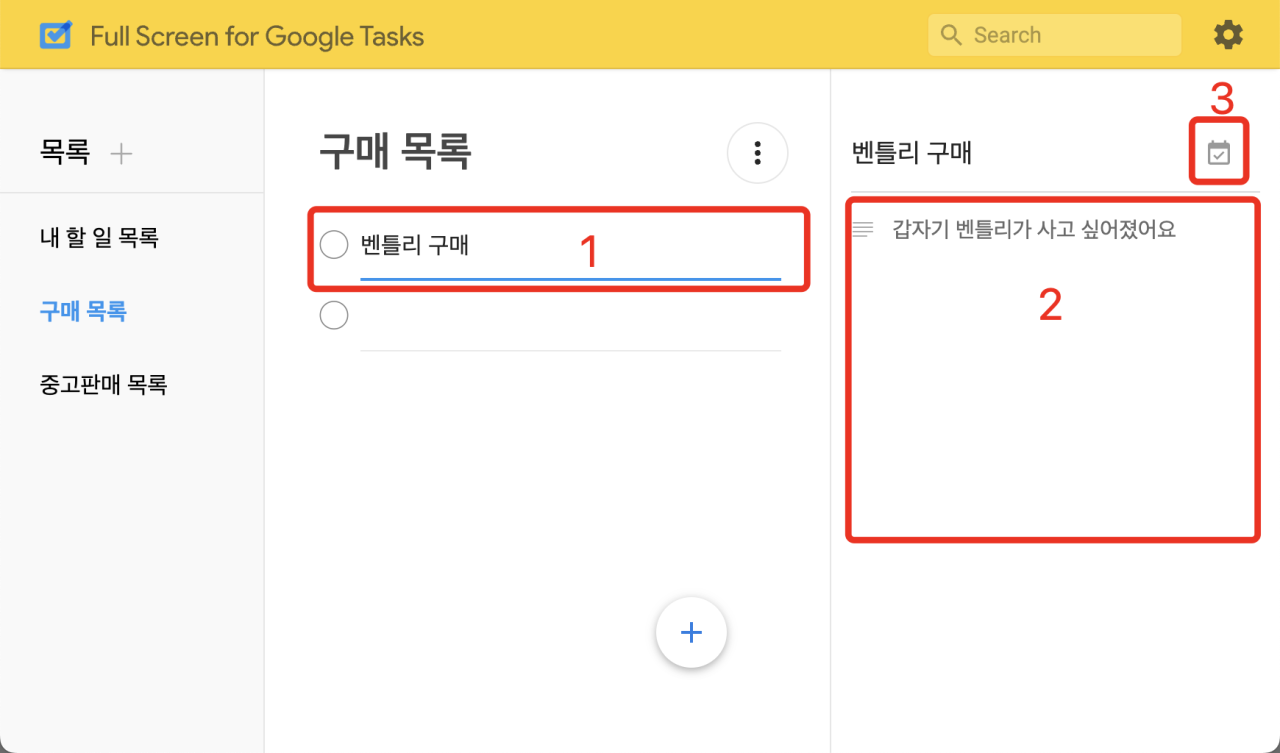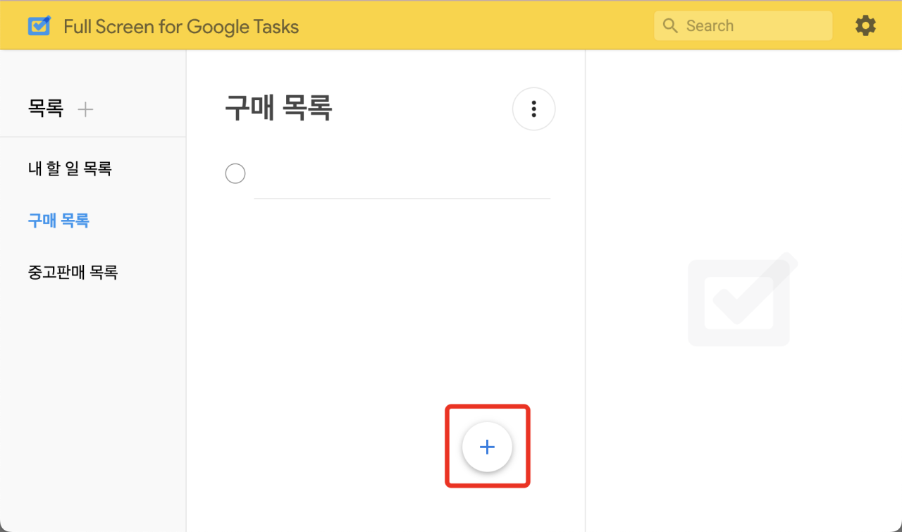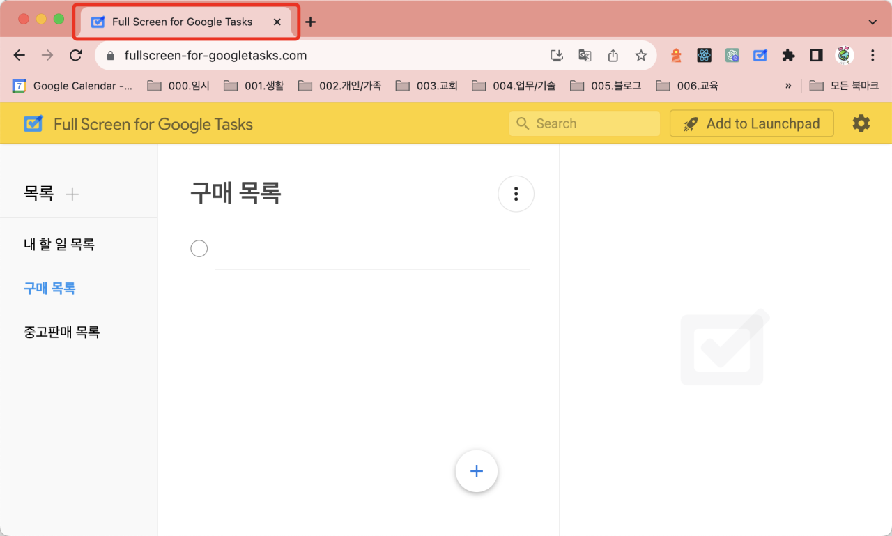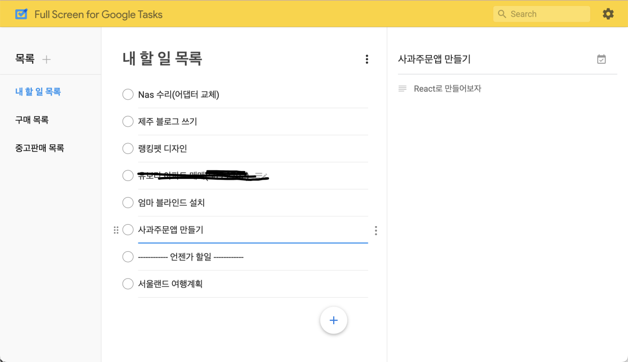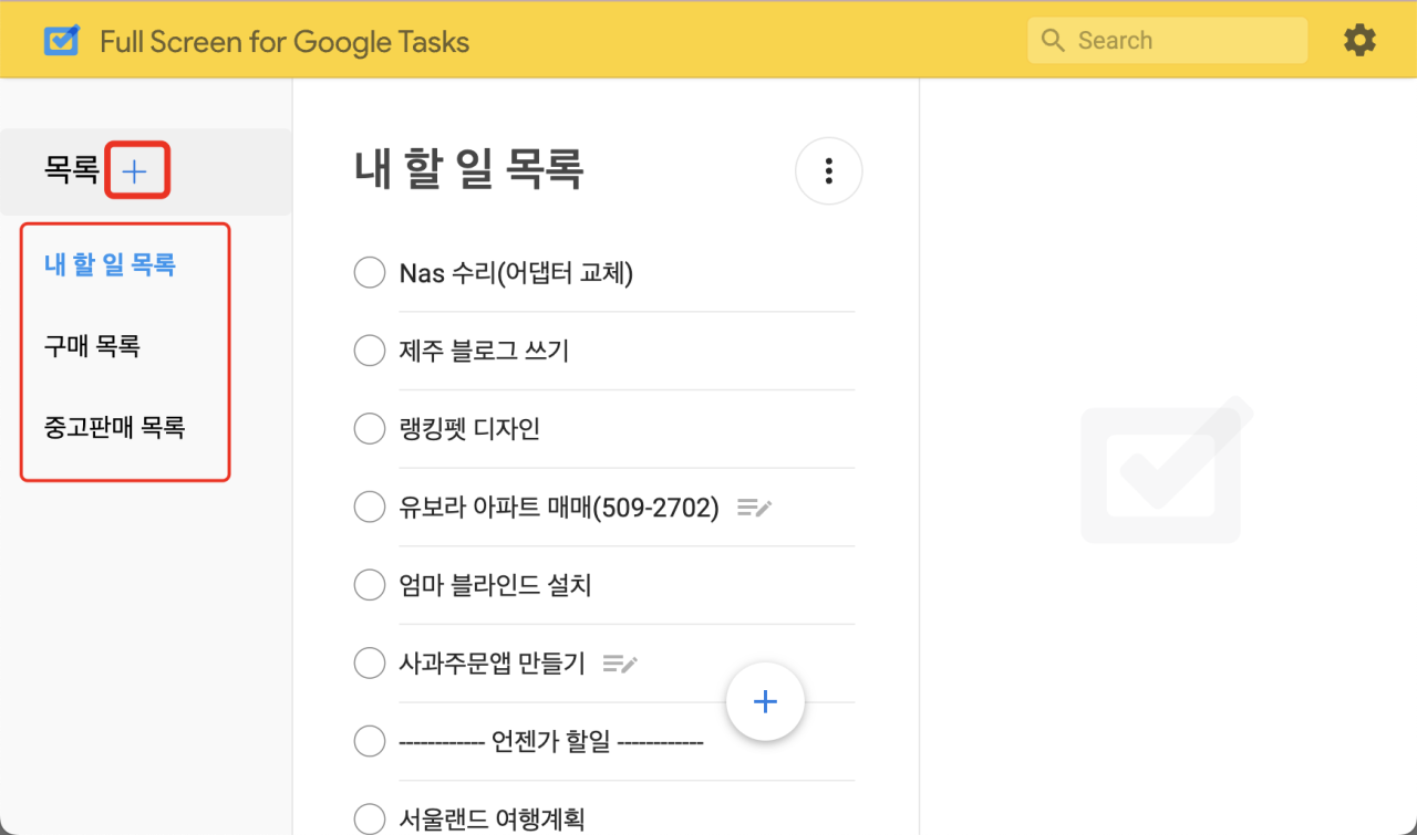 fullscreen for googletasks, TasksBoard for Google 등 이런 류의 익스텐션이 몇 개 더 있지만 사용해 본 결과 저에게는 fullscreen for googletasks 익스텐션이 더 잘 맞아서 이것을 선택했습니다.