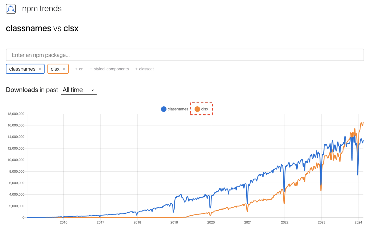 npm 트렌드를 살펴보면 계속 Classnames이 상위권에 속해 있었으나 근래들어 clsx가 역전을 한것을 볼 수 있습니다. 그래서 이 포스팅에서는 clsx에 대해서 좀더 알아보고 실제 예제 코드를 활용하여 사용법을 알아보도록 하겠습니다.